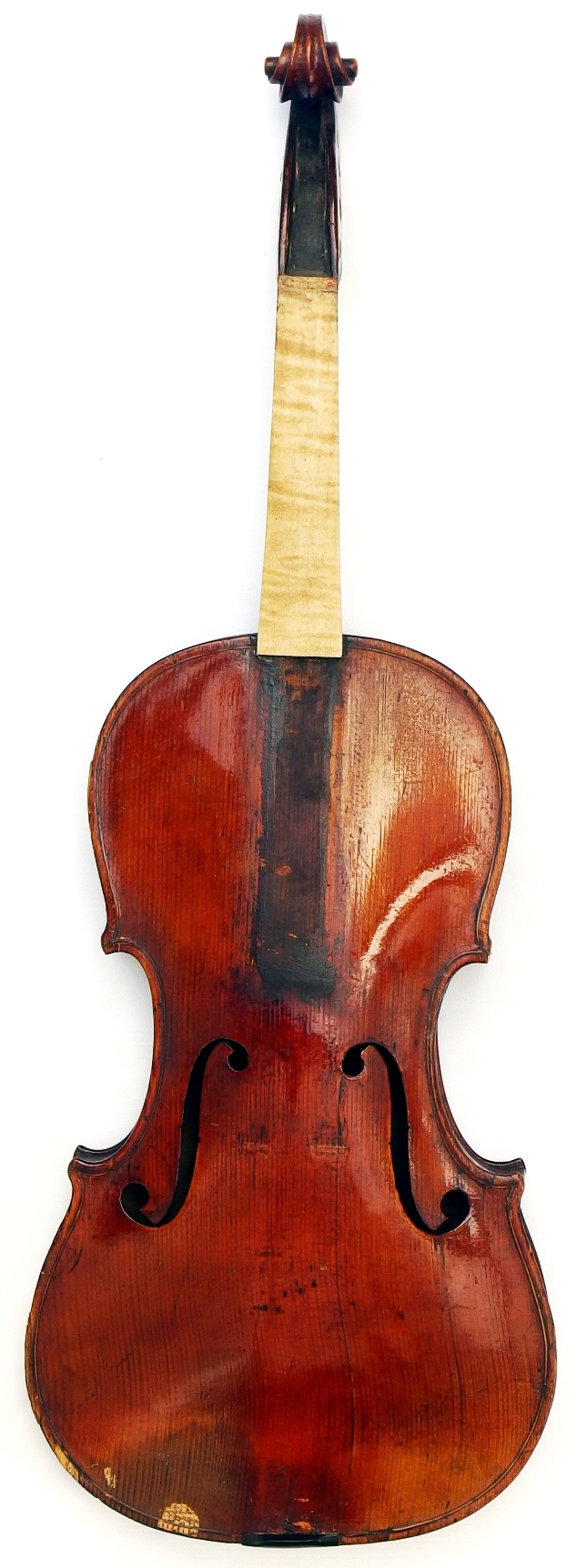 Violine um 1825/30 (Privatbesitz). Die Decke ist aus einem Stück gearbeitet. Schwer lesbarer und sehr verwitterter Geigenzettel: "Jan(?)uarius Gagliano 17.. Napoli"